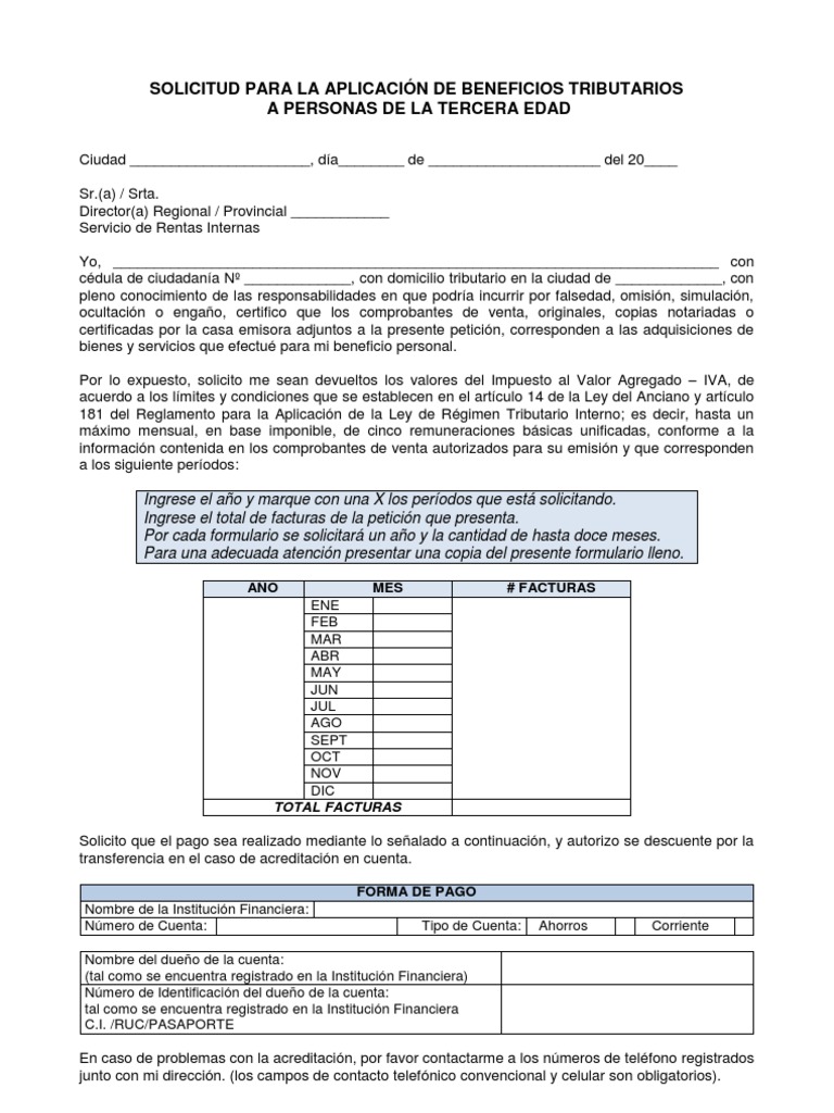 Formarto de devolucion iva sri a personas de tercera edad. Durante 2020 este incentivo llegó a 1 millón de hogares correa recordó que para ser parte de los programas ingreso solidario y devolución del iva no se realizan inscripciones, no hay intermediarios, ni hay. Para poder lograr la sri devoluciones de iva para adultos mayores, se debe cumplir una serie de condiciones, requisitos y procedimiento. La devolución del iva a las personas de la tercera edad puede solicitarse por medio de tres canales y de acuerdo al canal seleccionado por el contribuyente variaran los requisitos solicitados. El dps anunció que aquellos hogares habilitados que no pudieron cobrar el incentivo del último ciclo de pago de los programas devolución del iva y de ingreso solidario lo.